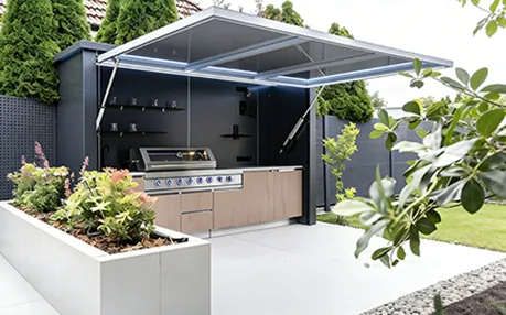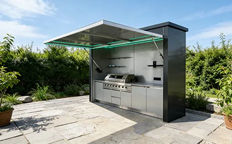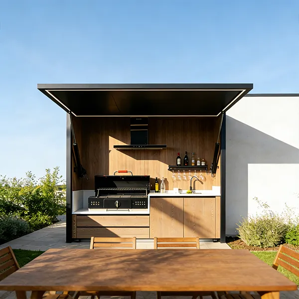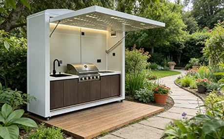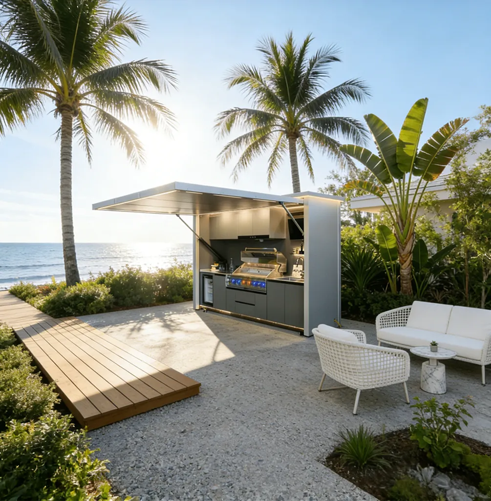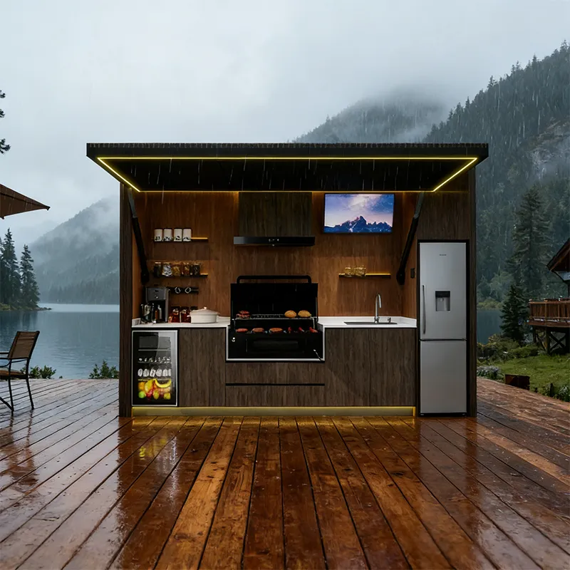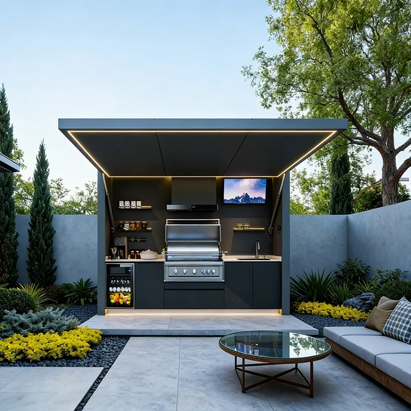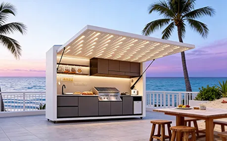 This outdoor kitchen features a modular, stylish and durable design ideal for outdoor use, supporting export customization. It includes a food-grade 304 stainless steel grill with CE certification, a custom-voltage range hood and refrigerator with SAA certification, and a Watermark-compliant faucet with heating options. Intelligent functions include electric roller doors, voice-controlled lifting cabinet, international track sockets and toggle switches. Built with 1.2–1.5mm stainless steel cabinets and countertops, 2.0mm aluminum wall panels, and insulated steel framing, it is rustproof, waterproof and heat-resistant. It also offers RGB ambient lighting, Bluetooth speakers, TV mount and retractable awning.