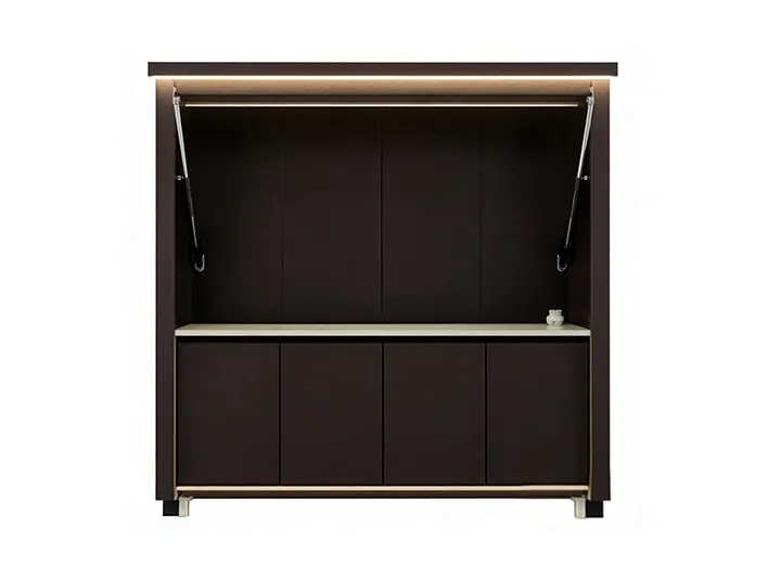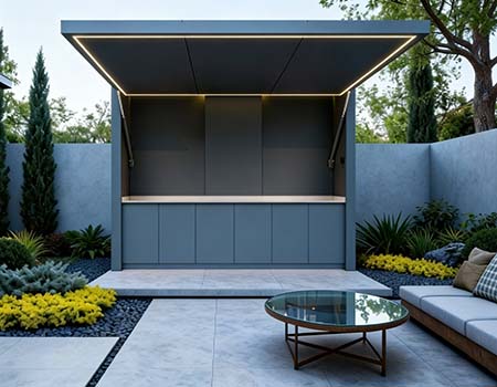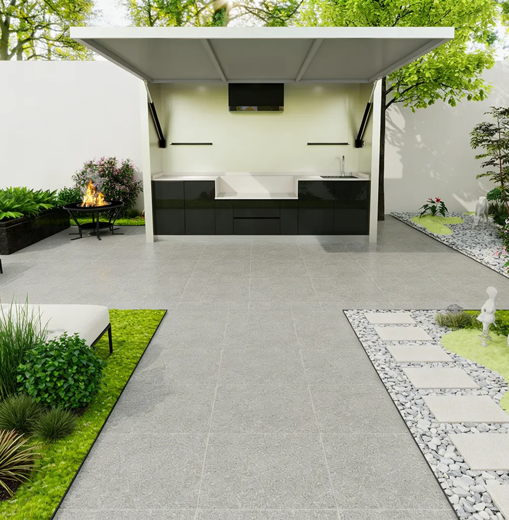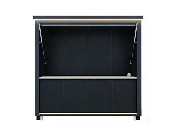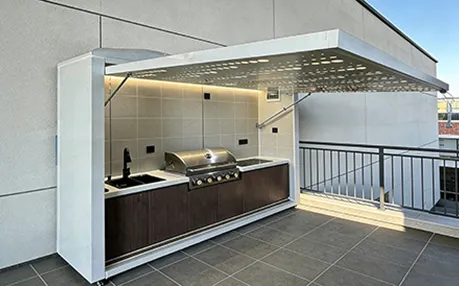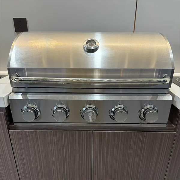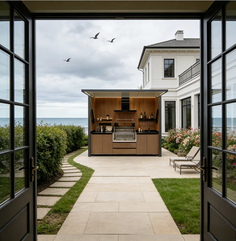 This outdoor kitchen features a modular, stylish and durable design ideal for outdoor use, supporting export customization. It includes a food-grade 304 stainless steel grill with CE certification, a custom-voltage range hood and refrigerator with SAA certification, and a Watermark-compliant faucet with heating options. Intelligent functions include electric roller doors, voice-controlled lifting cabinet, international track sockets and toggle switches. Built with 1.2–1.5mm stainless steel cabinets and countertops, 2.0mm aluminum wall panels, and insulated steel framing, it is rustproof, waterproof and heat-resistant. It also offers RGB ambient lighting, Bluetooth speakers, TV mount and retractable awning.